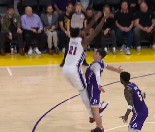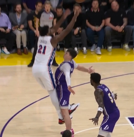 这姿势有点搞笑🤣恩比德诡异姿势造成拉拉维亚投篮犯规