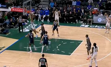 第四节比赛,吉昂径直杀入禁区双手暴扣,还剩3分钟雄鹿领先独行侠26分。